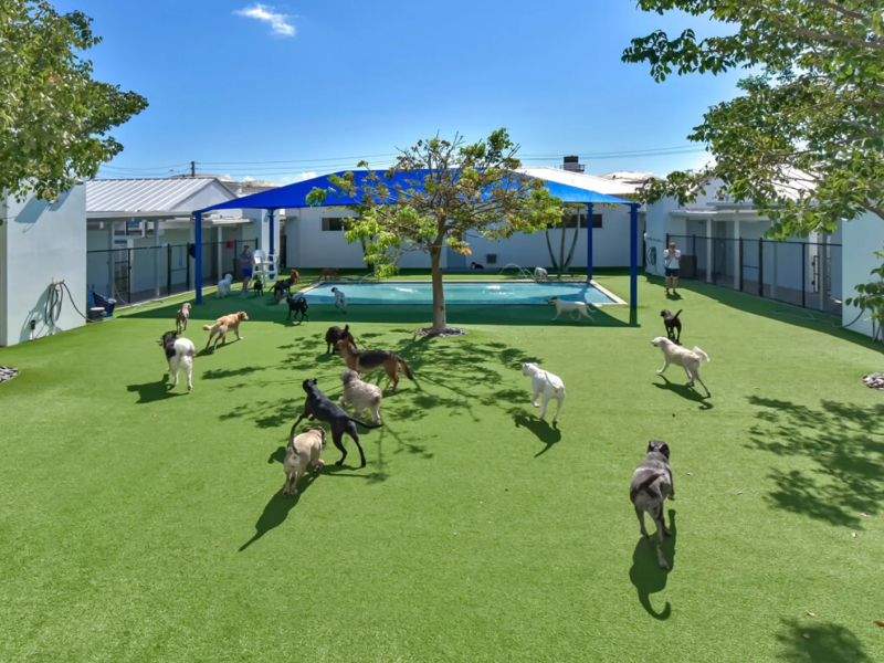 Daycare is available daily with experienced handlers supervising play in private dog parks and chemical-free pools designed for canine enjoyment. The play areas use turf and shaded zones to keep pets cool and active. New clients can get a free day of daycare to evaluate if it's a good fit before a boarding reservation.